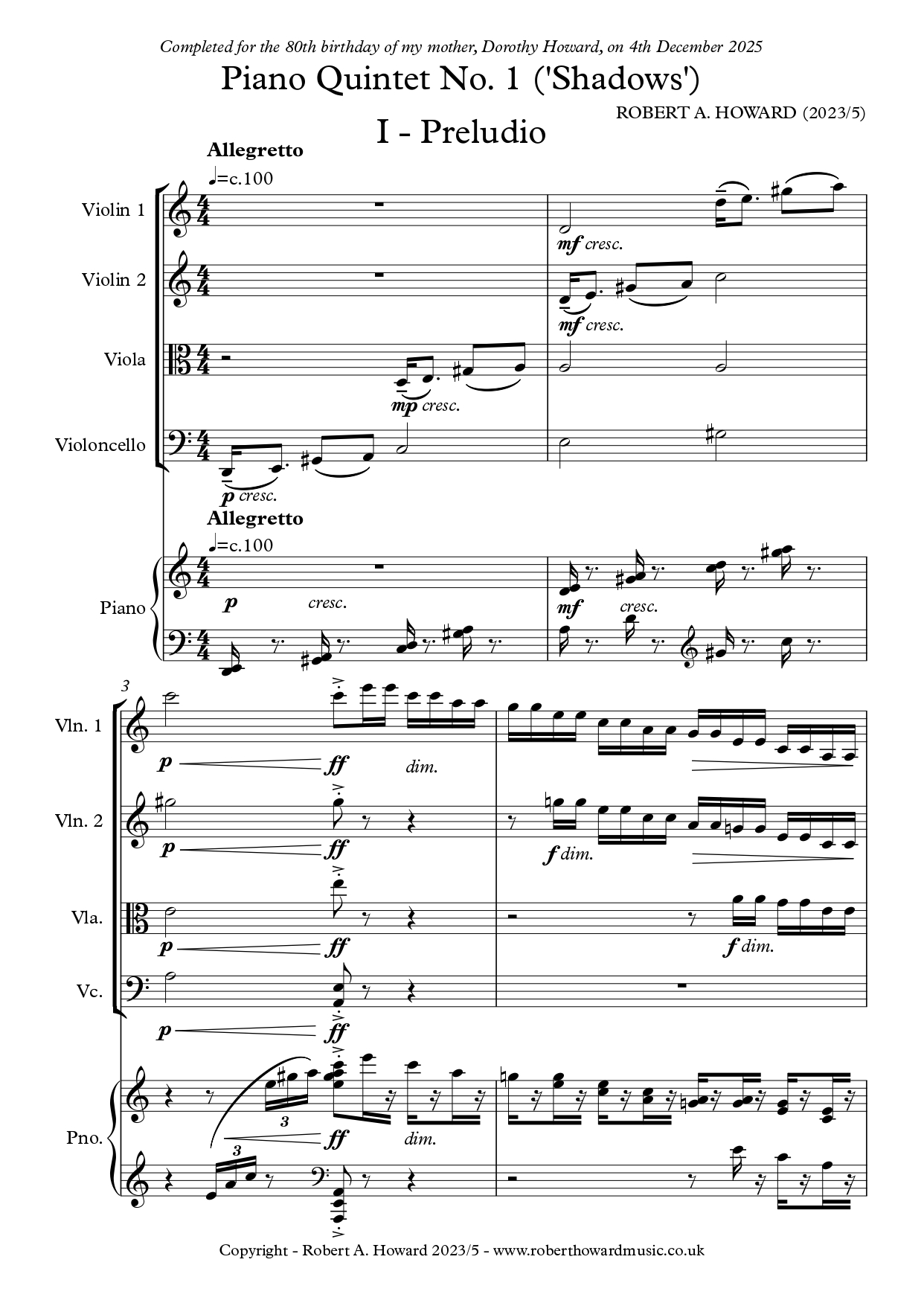 Piano Quintet No. 1 ‘Shadows’ (for piano & string quartet, 2023/5)